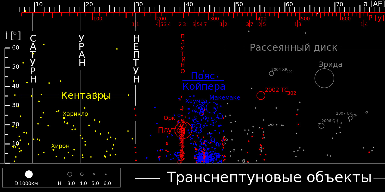 Большинство известных объектов пояса Койпера имеют большую полуось в диапазоне примерно между 35 и 48 а. е. (красные и синие объекты на диаграмме). Считается, что кентавры (показаны желтым) и объекты рассеянного диска (серые) ранее тоже располагались в поясе Койпера, но были рассеяны Нептуном внутрь и наружу.