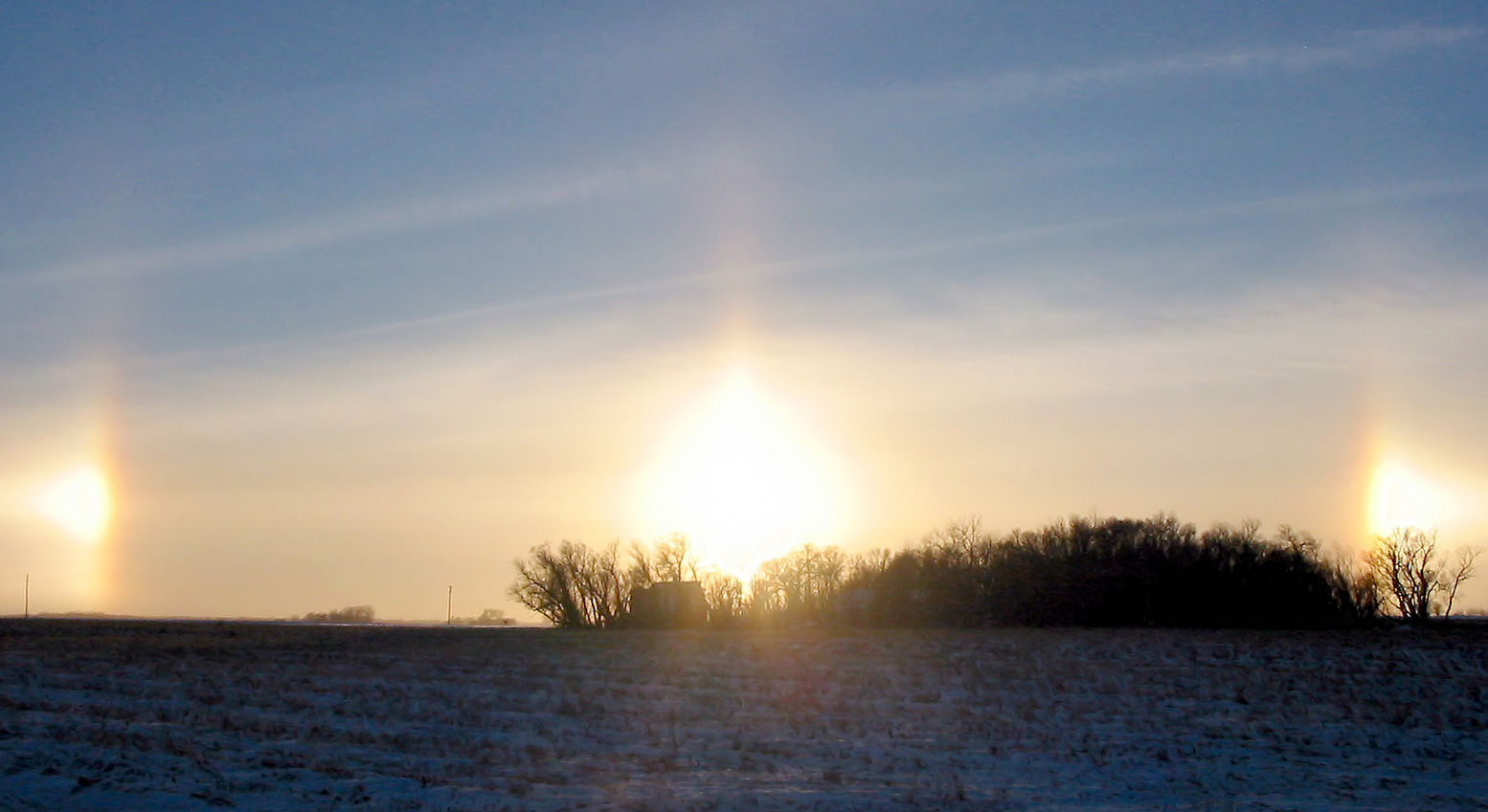 Ложные солнца во время заката в пригороде Нью-Ульма (Миннесота, США). По обе стороны от настоящего Солнца находятся ложные солнца, с гало-дугами, проходящими через каждый паргелий.