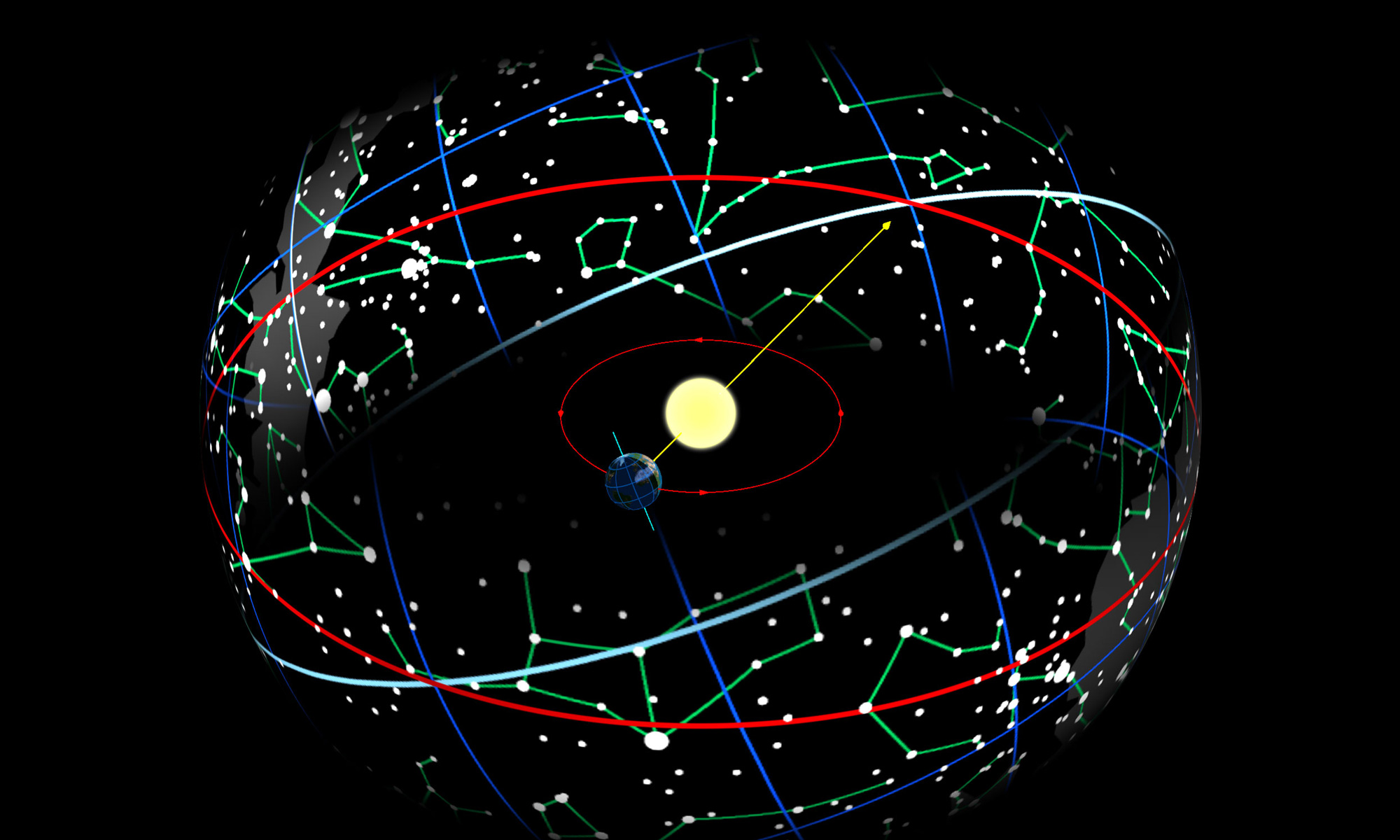 Видимое годовое движение Солнца по небесной сфере (эклиптика, показана красным), небесный экватор (показан бело-голубым) и зодиакальная зона. Пересечения эклиптики и небесного экватора – точки равноденствий