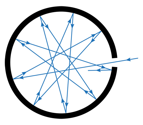 Сперва абсолютно черное тело ученые представляли как некую полость, в которой есть узкое отверстие. Излучение попадает в него и поглощается стенками. В таком случае на этот спектр излучения похож спектр излучения отверстия колодца или входа в пещеру. Но больше всего с ним совпадают спектры излучения Вселенной, в том числе Солнца.