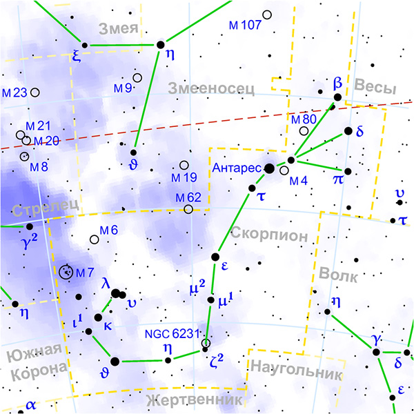 Расположение Антареса (красного сверхгиганта) в созвездии Скорпиона.